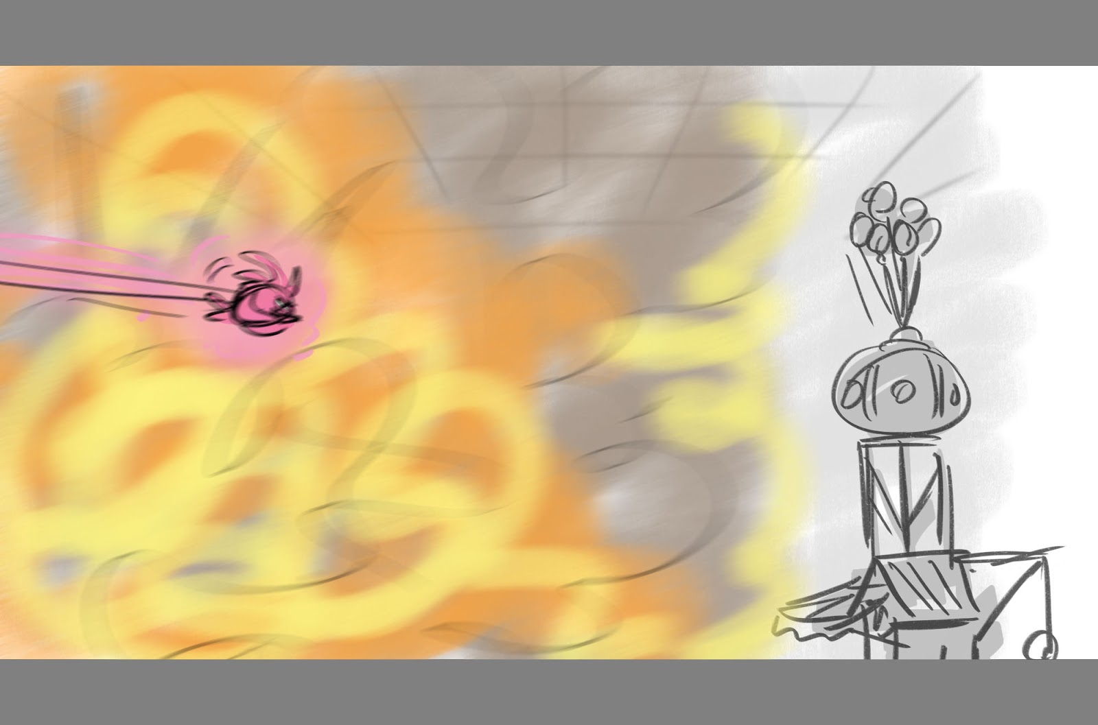 As a story artist, you relish these assignments, where story, dialogue and design are kind of left up to your imagination. Lucky for me I have a bizarrely unhinged imagination so I went nuts. When showing Fergal some initial really rough story beats, he encouraged me to go even crazier! God, he's a good director. (;^D